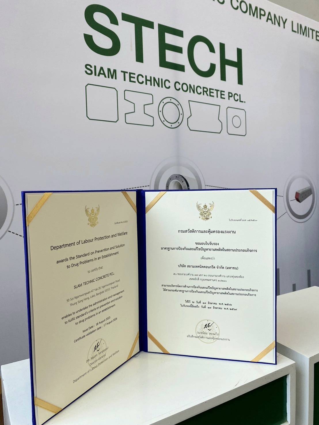 บริษัท สยามเทคนิคคอนกรีต จำกัด (มหาชน) หรือ STECH ได้เข้ารับประกาศเกียรติคุณสถานประกอบกิจการที่เป็นแบบอย่างที่ดีในการบริหารจัดการปัญหายาเสพติด ในวันพุธที่ 26 มิถุนายน 2567 ณ.ห้องประชุมชั้น 5 กระทรวงแรงงาน โครงการมาตรฐานการป้องกันและแก้ไขปัญหายาเสพติดในสถานประกอบการกิจการ (มยส.) ประจำปี 2567 จากอธิบดีกรมสวัสดิการและคุ้มครองแรงงาน โดยบริษัทฯ ดำเนินการระบบมาตราฐานการป้องกันและแก้ไขปัญหายาเสพติดในสถานประกอบกิจการ (มยส.) อย่างต่อเนื่องครบ 3 ปี