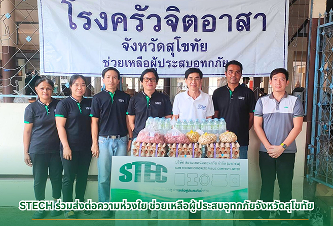 บริษัท สยามเทคนิคคอนกรีต จำกัด (มหาชน) หรือ STECH สาขาสุโขทัย นำโดย คุณมนตรี อินทรเทียม ผู้จัดการโรงงาน พร้อมด้วยพนักงาน ร่วมส่งต่อความห่วงใยมอบสิ่งของจำเป็นสำหรับประกอบอาหาร เพื่อสนับสนุนการช่วยเหลือผู้ประสบอุทกภัยในพื้นที่อำเภอเมือง จังหวัดสุโขทัย โดยมีนายธีรยุทธ สำราญทรัพย์ รองผู้ว่าราชการจังหวัดสุโขทัย เป็นผู้แทนรับมอบสิ่งของในครั้งนี้ งานดังกล่าวจัดขึ้น ณ โรงครัวจิตอาสา จังหวัดสุโขทัย เมื่อเร็ว ๆ นี้ โดย STECH ขอร่วมส่งกำลังใจและความช่วยเหลือแก่ผู้ประสบภัยให้สามารถผ่านพ้นสถานการณ์ไปได้โดยเร็ว